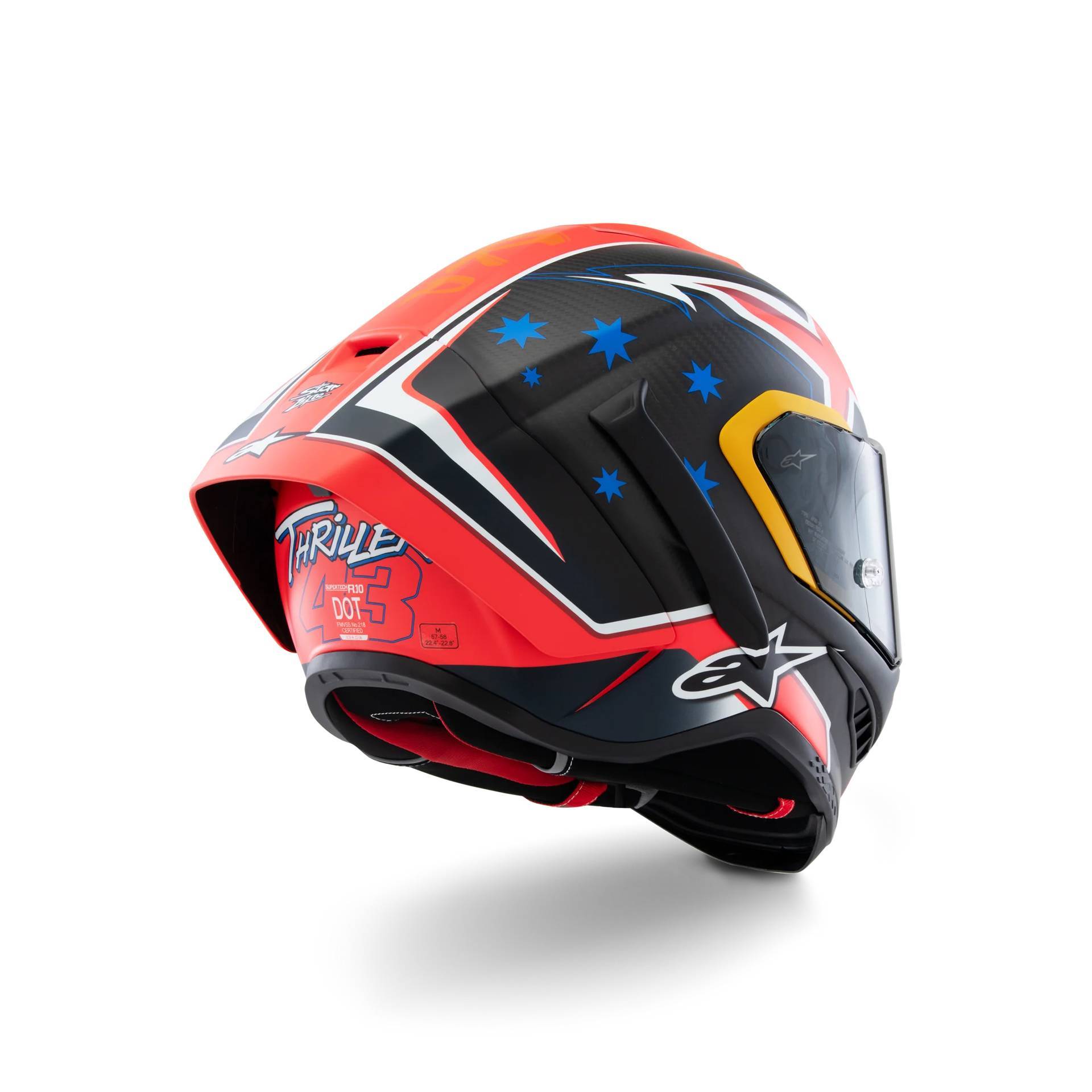 O resultado de mais de 10 anos de estudo intensivo, desenvolvimento e testes, o objetivo da família de capacetes Supertech é criar os capacetes mais avançados, protetores e que melhoram o desempenho possível para pilotos e motociclistas em todo o mundo. Após anos de extensa pesquisa, desenvolvimento e testes do capacete de corrida de estrada Supertech R10 pelo Departamento de Desenvolvimento de Produtos de Capacetes da Alpinestars, juntamente com a lenda do MotoGP Andrea Dovizioso, e os pilotos de MotoGP Jorge Martin e Jack Miller. Com o S-R10, o foco do design foi garantir o mais alto nível de desempenho, especialmente no que diz respeito à proteção e a um novo nível de segurança. O Capacete S-R10 foi projetado para proporcionar a combinação perfeita de excelente ventilação, conforto incomparável e o menor peso possível sem comprometer qualquer outro aspecto. Outro elemento crucial e único no design e desenvolvimento do S-R10 são as aerodinâmicas avançadas do capacete, com inúmeras sessões no túnel de vento visando reduzir o arrasto e proporcionar estabilidade aerodinâmica ideal.